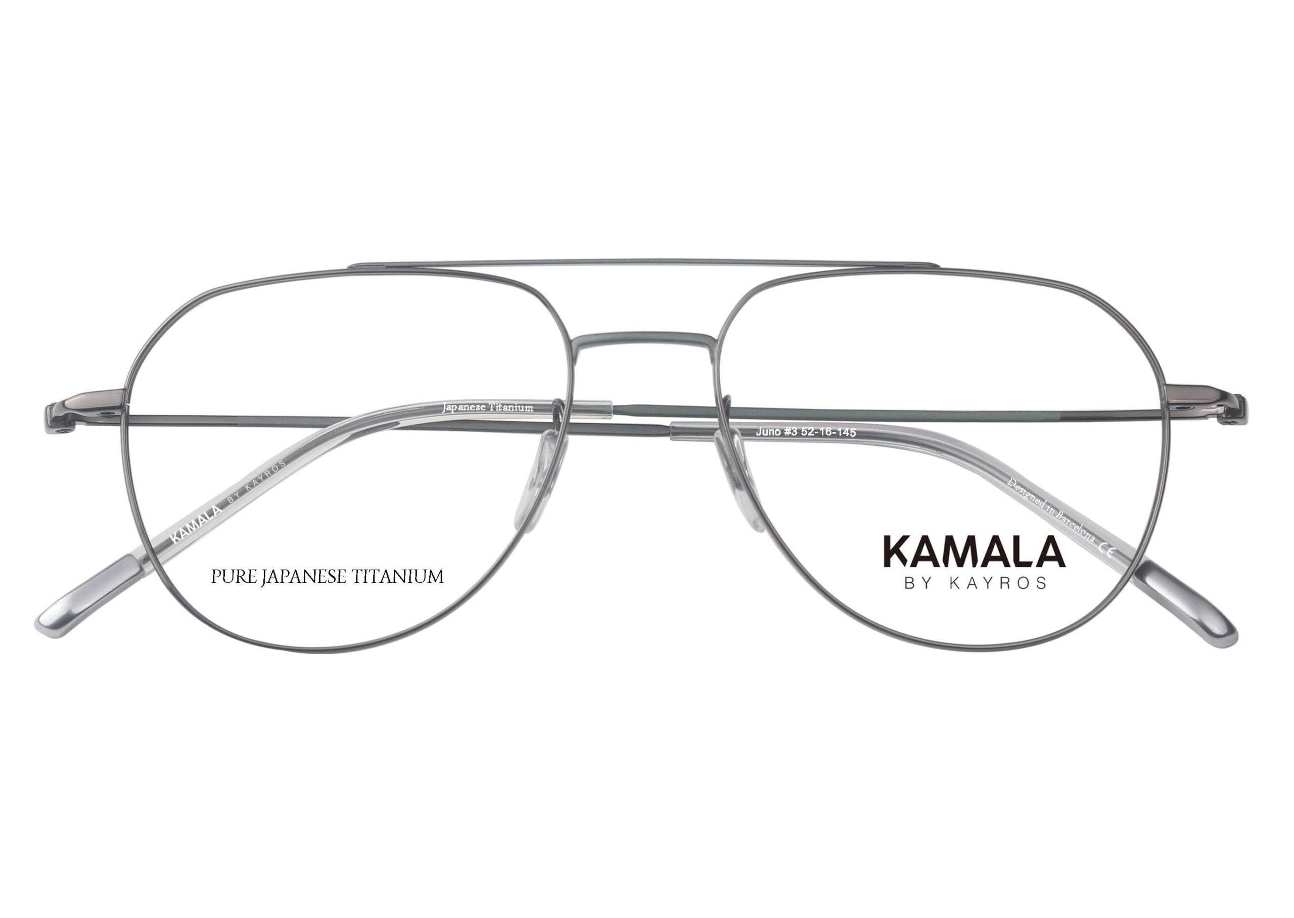 El modelo JUNO es una montura hecha en titanio puro japonés y elaborada de manera artesanal. La montura tiene un estilo retro con doble puente.